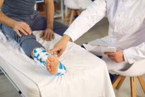An orthopedic doctor is pointing at a patient with a broken leg in a bandage at an orthopedic clinic.