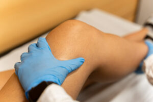 A sports medicine physician examines the knee joint of a woman experiencing pain from an ACL tear.