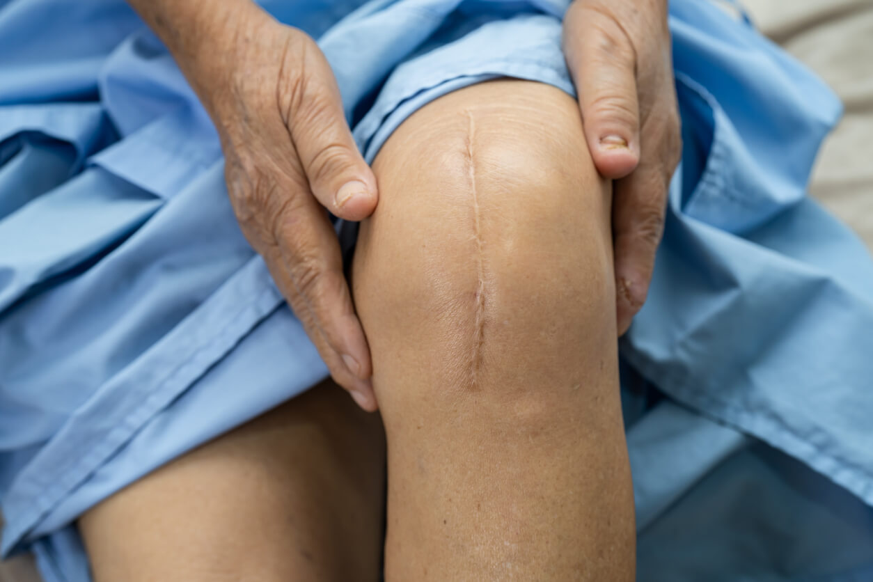 An elderly woman patient shows her scars from total knee joint replacement surgery.